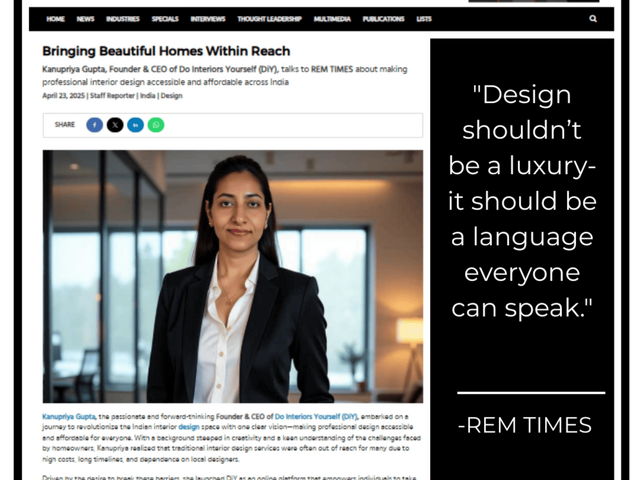 Break free from expensive designers and city-only services. Do Interiors Yourself (DiY) brings professional interior design, 3D visualizations, and Vaastu-compliant layouts to homes across India—at a fraction of the cost. Get ready-to-use design packs, clear layouts, and a “Buy The Look” feature for a complete space glow-up. As featured in REMTimes, DiY is making great design simple, accessible, and online-friendly. To know more, read our full article>> https://www.remtimes.com/blogs/interviews/bringing-beautiful-homes-within-reach.php