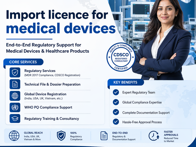 Import licence for medical devices is a regulatory requirement for importing healthcare products into India. Managed by CDSCO under Medical Device Rules, the process involves classification, technical documentation, and application submission via the online system. It ensures that imported devices comply with safety, quality, and performance standards. Securing this licence enables companies to legally market and distribute medical devices while maintaining compliance with Indian regulatory authorities.
