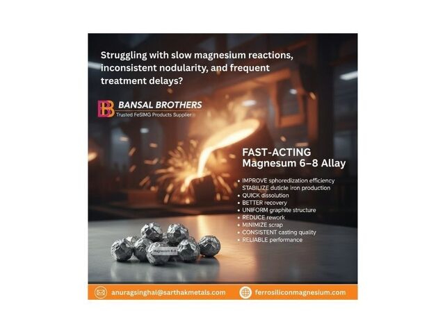 Struggling with slow magnesium reactions, inconsistent nodularity, and frequent treatment delays? Bansal Brothers, a trusted FeSiMg products supplier, offers fast-acting Magnesium 6–8 alloy designed to improve spheroidization efficiency and stabilize your ductile iron production process.